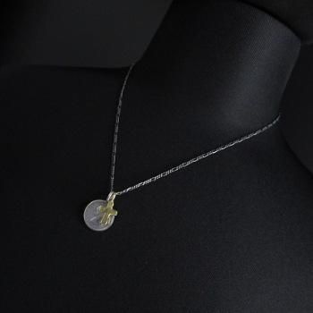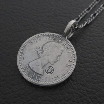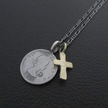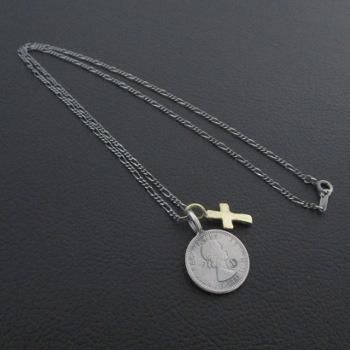 幸せを呼ぶコインといわれる“60年代の6ペンスコイン”とクロスネックレス。